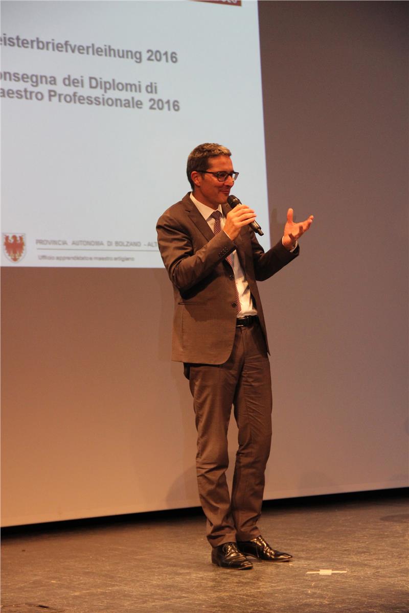 Schließlich ging der Landeshauptmann auf das Thema der Anerkennung der Südtiroler Meisterausbildung im Ausland ein. „Die Bedeutung eines Abschlusses definiert sich unter anderem auch darüber, ob er in anderen Ländern anerkannt ist“, sagte er. „Südtiroler Meister werden bereits zum Universitätsstudium im Bayern zugelassen und die Tiroler Meisterprüfungsstelle erkennt unsere Meisterprüfungen informell an, denn sie genießt im deutschsprachigen Ausland einen sehr guten Ruf. Für die offizielle Anerkennung des Südtiroler Meisterbriefes in Österreich, die bisher zu aufwändig war, streben wir ein Abkommen mit Österreich an, das die gegenseitige Anerkennung der Meisterbriefe zum Inhalt hat“, erklärte der Landeshauptmann. Wenn alles planmäßig läuft sollte einer Unterzeichnung des Abkommens im Frühjahr/Sommer 2017 nichts im Wege stehen.