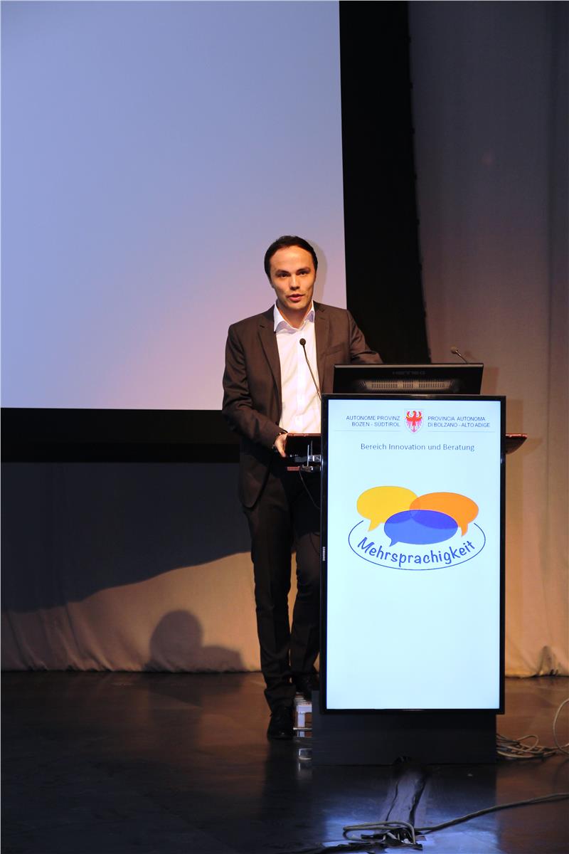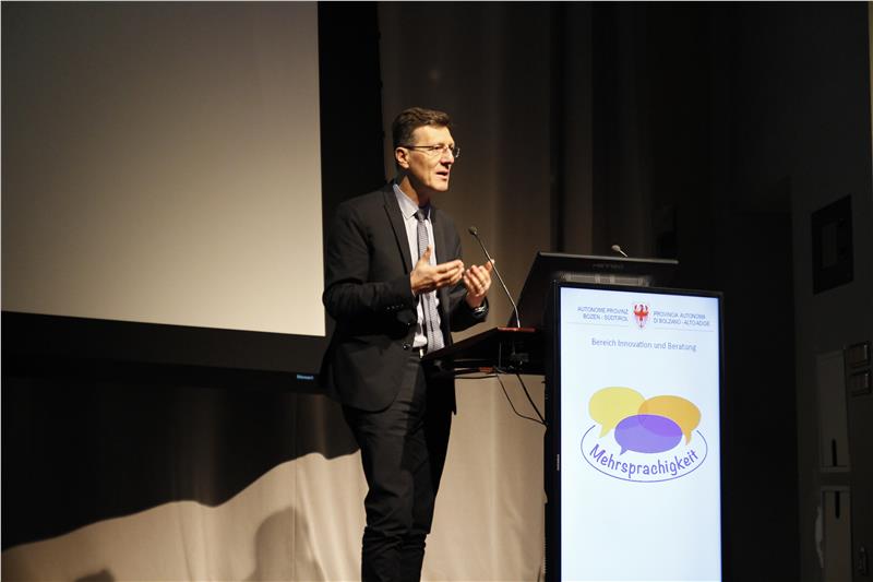 Bildungslandesrat Philipp Achammer bezeichnete in seiner Begrüßung das Mehrsprachencurriculum als einen Meilenstein. Er merkte an, dass Mehrsprachigkeit ein Reichtum sei, den es zu nutzen gelte. Denn sie eröffne nicht nur den Zugang zu einer anderen Kultur, sondern ermögliche es auch, aufeinander einzugehen und leiste einen Beitrag zur geistigen Freiheit. "Mehrsprachigkeit ist jedoch nicht nur eine Aufgabe der Lehrpersonen, sondern bezieht die gesamte Gesellschaft mit ein", gab der Landesrat zu verstehen und regte an, den Wandel von einer Kultur der Einsprachigkeit zu einer Kultur der Mehrsprachigkeit zu vollziehen. "Dabei geht es nicht einzig und allein um die Kenntnis mehrerer Sprachen, sonder um Verflechtung, Wertevorstellungen, interkulturelle Fähigkeiten und plurikulturelle Kompetenzen", stellte Achammer fest.