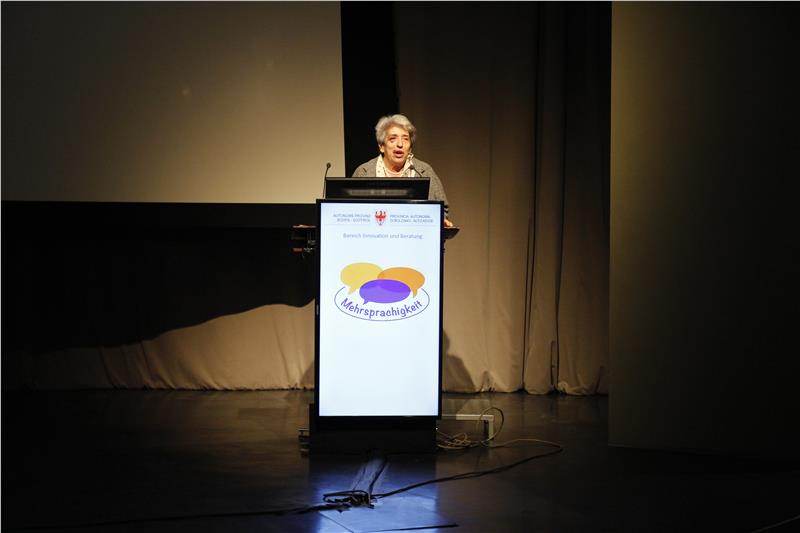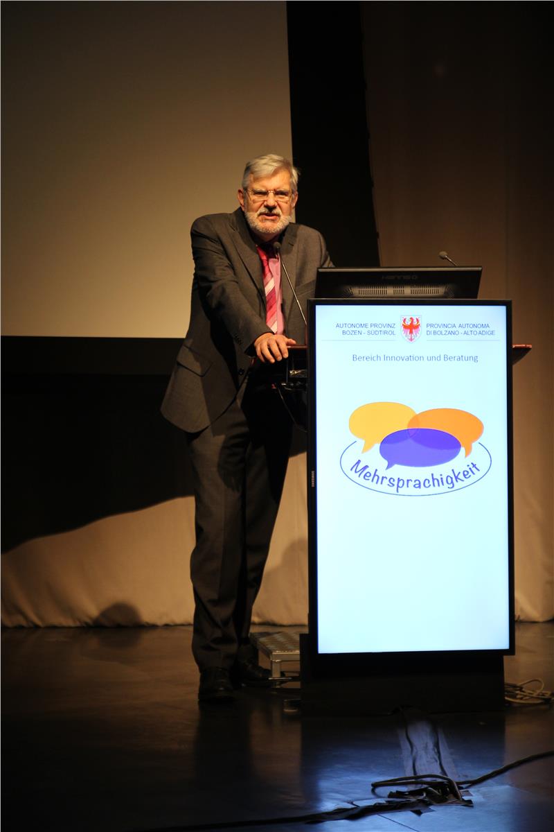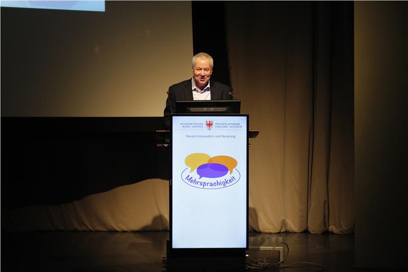 Ferdinand Patscheider, derzeit Direktor der Europäischen Schule in Frankfurt am Main und langjähriger Schulentwicklungsberater und Schulinspektor in Südtirol, beleuchtete in seinem Vortrag die Mehrsprachigkeit aus einem europäischen Kontext, ging aber auch auf die Situation in Südtirol ein. Bereits 2002 haben die Staats- und Regierungschefs der Europäischen Union bei einem Treffen in Barcelona den Unterricht von mindestens zwei Fremdsprachen ab der frühen Kindheit gefordert. "Mehrsprachigkeit als Bildungsauftrag beinhaltet nicht nur Sprache, sondern auch Kultur", sagte Patscheider und stellte fest, dass es nicht genügt, sich Mehrsprachigkeit auf die Fahne zu schreiben: „Es gibt zwar viele Absichtserklärungen, bei der Umsetzung in der Praxis treten jedoch häufig Probleme auf“, so Patscheider. Er wies darauf hin, dass allzu oft noch von der "Normalitätsannahme" ausgegangen werde, wonach die Mehrheit der Kinder weltweit einsprachig aufwachsen – dies sei jedoch ein Irrtum.