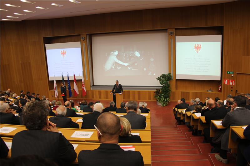 Begrüßen konnte Landeshauptmann Kompatscher unter den rund 600 Konferenzteilnehmern Bischof Ivo Muser, die Landeshauptleute Ugo Rossi (Trentino) und Günther Platter (Bundesland Tirol), Alt-Landeshauptmann Luis Durnwalder, den Universitätspräsidenten Konrad Bergmeister, den Vizerektor der Universität Innsbruck Bernhard Fügenschuh, Europaparlamentarier Herbert Dorfmann, die Landtagspräsidenten von Südtirol und des Trentino, die Mitglieder der Südtiroler Landesregierung, den Vorsitzenden des Südtirol-Unterausschusses Hermann Gahr, die Abgeordneten und Senatoren zum römischen Parlament, zahlreiche Südtiroler Bürgermeister, Vertreter der Gerichtsbarkeit, Staatsvertreter, den Generalkonsul der Republik Österreich Wolfgang Spadinger sowie die Mandatare des Landtags und des Regionalrats, Vertreter aus den Bereichen Wissenschaft und Kultur sowie der Verbände und zahlreiche Führungskräfte der Landesverwaltung. Besonders begrüßte der Landeshauptmann die Studierenden, die „die Zukunft unseres Landes und Europas gestalten werden“.