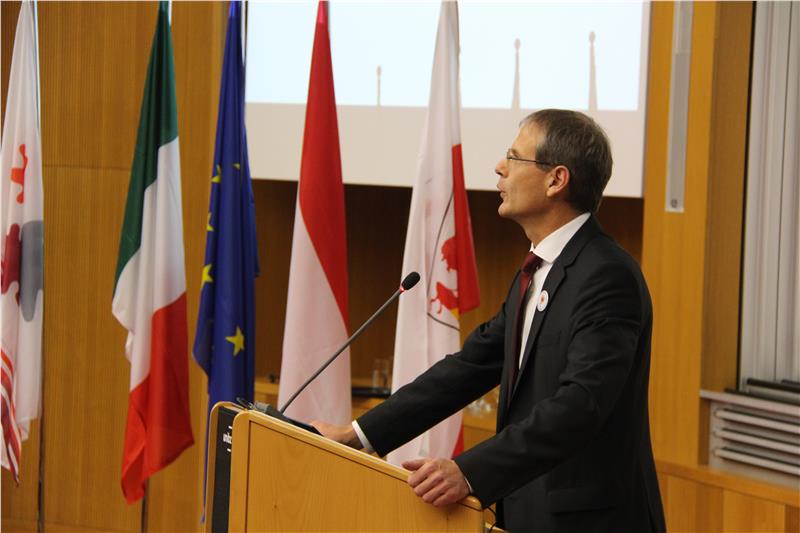 Der Hausherr, Universitätspräsident Bergmeister, verwies in seinem Grußwort auf Wilhelm Leibniz, dem Vordenker Europas, der eigene Sprache und Kultur als Werte definiert hatte. Bergmeister unterstrich, dass in Europa Minderheiten als Mehrwert erkannt werden sollten. Der Vizerektor der Universität Innsbruck Bernhard Fügenschuh berichtete bei seiner Begrüßung über die enge Zusammenarbeit der Universitäten im Sinne der Europaregion.