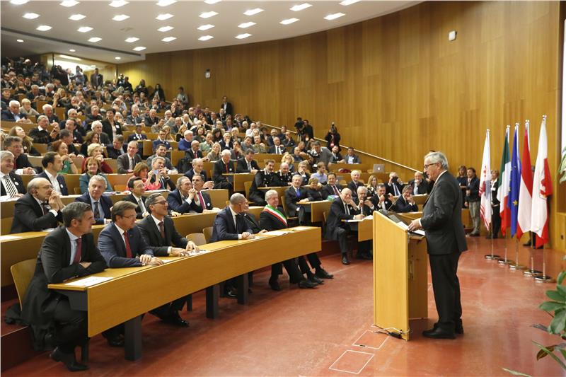Mit einem Plädoyer für ein geeintes Europa, in dem die Mitgliedsländer sich die Souveränität teilen und sich solidarisch zur Seite stehen, sorgte der Präsident der Europäischen Kommission, Jean-Claude Juncker heute Mittag an der Freien Universität Bozen für den Höhepunkt der Konferenz zu „Autonomie und Föderalismus in Europa“. „Europa ist der Dialog zwischen Souveränität und Solidarität“, erklärte Juncker wörtlich. Die Europäische Kommission sei zu oft der Prügelknabe und werde für alles in die Verantwortung genommen, beklagte Juncker. Wenn etwas gut funktioniere, so sei es das Verdienst der einzelnen Staaten, wenn etwas schlecht funktioniere, liege die Schuld bei der Kommission. „Man kann aber nicht beim Nehmen Vollzeiteuropäer und beim Geben ein Teilzeit-Europäer sein“, so Juncker.