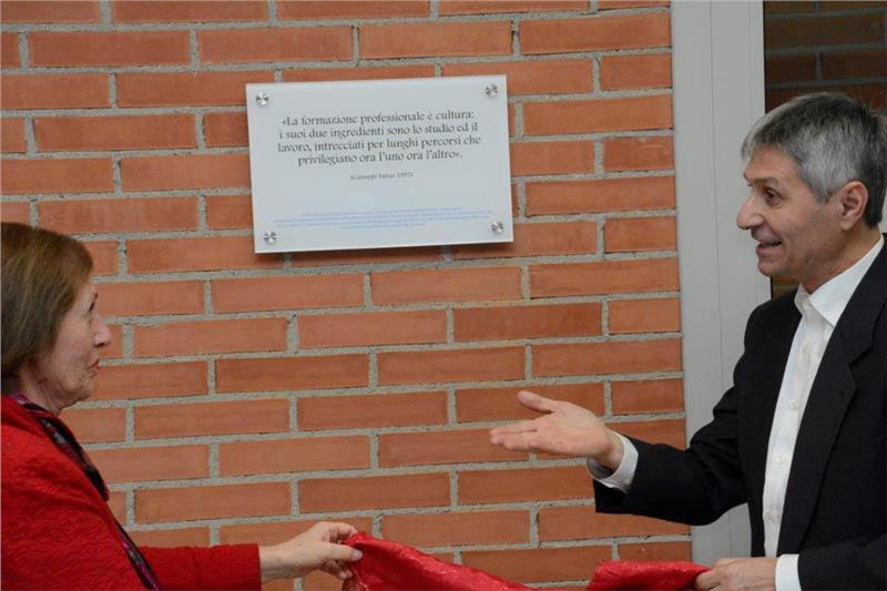 Im Rahmen der Einweihung fand zudem die Enthüllung einer Gedenktafel für den Schulinspektor Giuseppe Farias* statt. Daran nahmen auch dessen zwei Töchter und sein Sohn teil. Die Tafel befindet sich im Eingangsbereich des neuen Gebäudes, der zugleich den Schnittpunkt zwischen dem „alten“ und dem „neuen“ Gebäudekomplex darstellt.