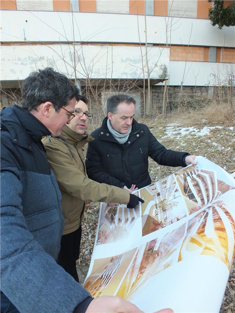 Landesrat Christian Tommasini hat kürzlich zusammen mit den Verantwortlichen des Wohnbauinstitutes Heiner Schweigkofler, Wilhelm Palfrader und Gianfranco Minotti das Areal besichtigt, um sich selbst einen Überblick über die Situation zu verschaffen, nachdem in Vergangenheit bereits öfters Personen in das leerstehende Gebäude eingedrungen waren, was nicht ungefährlich ist. Bei der Besichtigung ging es zum einen darum, das bestehende Gebäude und Gelände so zu sichern, dass ein Zutritt nicht mehr möglich ist, um Gefahren auszuschließen, und zum anderen darum, das Vorhaben, dort Sozialwohnungen des Wohnbauinstitutes zu verwirklichen zu beschleunigen.