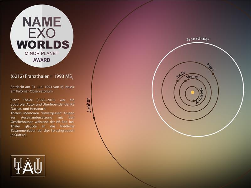 Vor zwei Jahren hat das Planetarium Südtirol am Wettbewerb "Name ExoWorld" der Internationalen Astronomischen Union (IAU) teilgenommen. Bei diesem Wettbewerb ging es darum, neue, treffende Namen für Planeten zu erfinden, die um weit entfernte Sterne kreisen. Der Vorschlag des Planetariums Südtirol wurde in einer Online-Abstimmung mit den meisten Stimmen zum Sieger erkoren. Als Preis durfte das Planetarium Südtirol einen Kleinkörper in unserem Sonnensystem taufen.