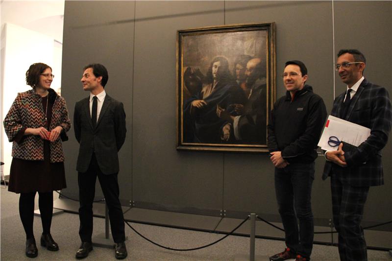 Kurator Novello ging näher auf das Werk ein, das eine Begebenheit aus den Evangelien nach Matthäus (Mt 22, 15-22), Lukas (Lc 20, 20-26) und Markus (Mc 12, 13-17) nachzeichnet. Beschrieben ist, wie eine Gruppe Pharisäer und Herodianer im Tempel von Jerusalem Jesus fragt, ob es legitim sei, Cäsar einen Tribut zu zahlen. Die Antwort Jesus ist bekannt: „So gebet dem Kaiser, was des Kaisers ist, und Gott, was Gottes ist!“
