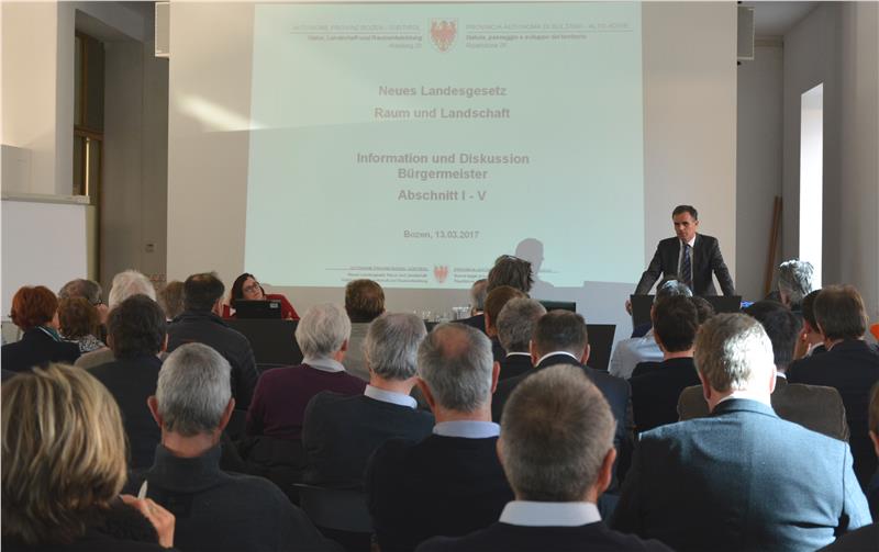 Bürgermeister und Gemeindereferenten aus dem ganzen Land hatte Landesrat Richard Theiner heute (13. März) mit dem Präsidenten des Gemeindenverbandes, Andreas Schatzer, nach Bozen eingeladen, um sie auf den neuesten Stand der Diskussion um das Landesgesetz Raum und Landschaft zu bringen. „Schließlich ist einer der Kernpunkte des neuen Gesetzes, dass den Gemeinden wesentlich mehr Zuständigkeiten zugeschrieben werden und diese vor allem von den Bürgermeistern wahrgenommen werden“, erklärte Theiner. Weil den Gemeinden eine derart zentrale Rolle zukomme, seien sie von Anfang an in die Arbeitsgruppen eingebunden worden. „Zudem ist für uns klar, dass wir den Gesetzentwurf mit den Gemeinden abklären, bevor wir ihn in die Landesregierung und danach in den Landtag bringen“, so der Landesrat.