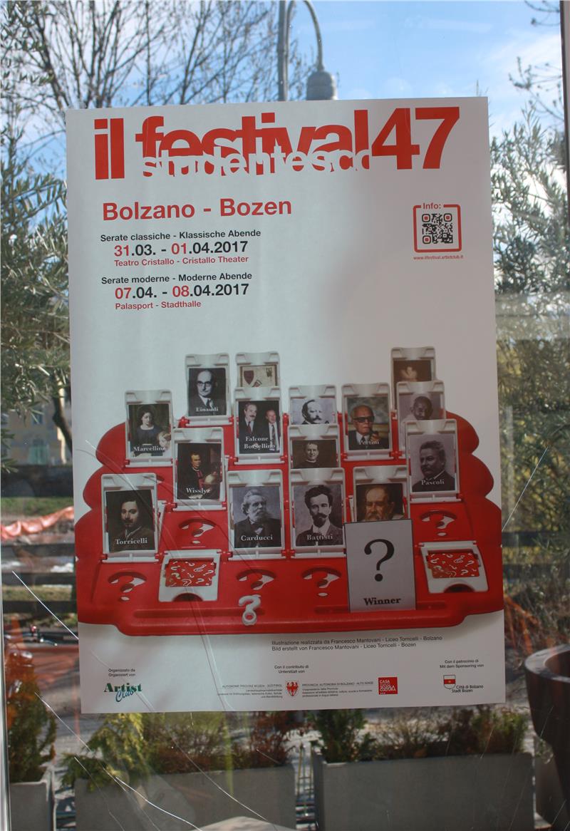 In jeder Disziplin wird eine Fachjury die Darbietungen der Schüler bewerten: Basierend auf der jeweiligen Punktzahl, zusammengesetzt aus der Summe der durch die einzelnen Jurymitglieder vergebenen Punkte, wird dann für jede Disziplin eine Rangliste erstellt (1. Platz, 2. Platz etc.). Aus den Rangpositionen in den einzelnen Disziplinen wird dann eine Gesamtpunktzahl errechnet, mit welcher dann der Sieger des Festivals ermittelt wird. Das sind die teilnehmenden Schulen: CTS Einaudi, Gymnasium v.d. Vogelweide, IIS Bressanone, IISS Galilei, IISS Gandhi, IPSCT de' Medici, ITAS Pertini, ITCAT Delai, ITE Battisti, Liceo Carducci, Liceo Marcelline, Liceo Pascoli, Liceo Rainerum, Liceo Torricelli, Professionali Levinas, Realgymnasium, Scuola alberghiera Ritz, WFO Kunter. Das Torricelli-Gymnasium hat sich bereits erste 25 Punkte verdient, indem es den Entwurf für das Plakat der Veranstaltung entwickelt hat.