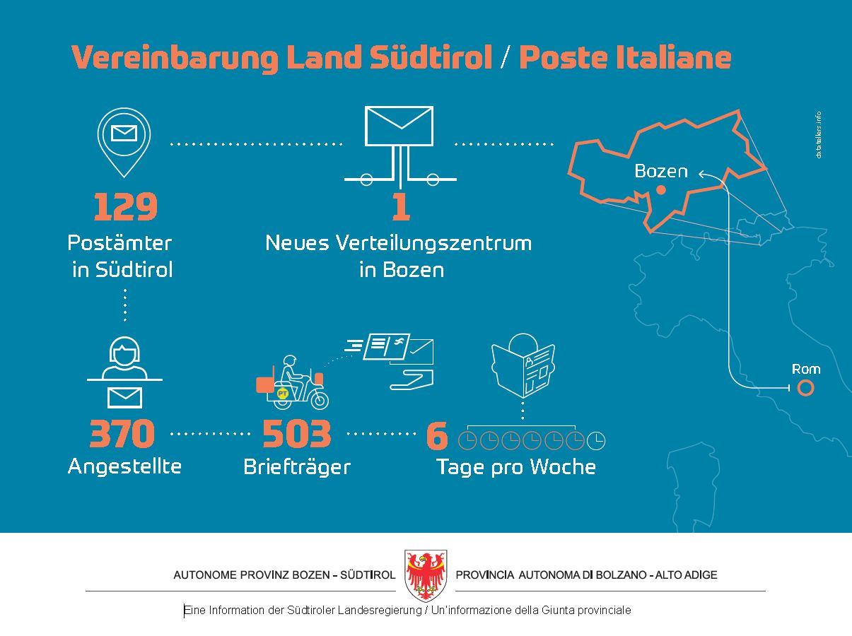 Zudem sollen die Postboten mit moderner Technologie ausgestattet werden, um die Zustellung und Nachverfolgbarkeit von Postsendungen zu verbessern. Vorgesehen ist auch die Einrichtung zweier Paketverteilerzentren in Bozen und Meran. „Schließlich ist es auch unser Bestreben, Schritt für Schritt die Einhaltung von Zweisprachigkeitspflicht und Proporz zu erreichen“, ergänzt Landeshauptmann Kompatscher.