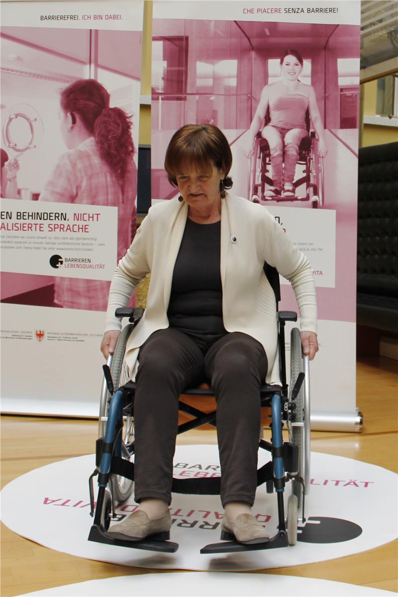 „Es geht um etwas ganz Besonderes. Mit der Sensibilisierungskampagne wollen wir nicht nur sichtbare, sondern auch mentale Barrieren Schritt für Schritt abbauen“, unterstrich Soziallandesrätin Martha Stocker heute (10. April) bei der Medienkonferenz. Mit der Aktion „barrierefreier Teppich“ will man dem Thema Barrierefreiheit wieder vermehrt Aufmerksamkeit schenken und legt die Teppiche deshalb in ausgewählten öffentlichen Strukturen für die Bevölkerung gut sichtbar aus. „Dieser Radius ist die gesetzliche vorgesehene Mindestnorm, um sich frei bewegen zu können. Doch nicht nur bauliche Maßnahmen werden für einen Abbau der Barrieren sorgen, vor allem ein Umdenken und eine andere Betrachtungsweise werden für die Zukunft ausschlaggebend sein“, meinte Luciana Fiocca, die Direktorin des Amtes für Menschen mit Behinderung. Insgesamt sind etwa 15 Prozent der Bevölkerung auf barrierefreie Lebensräume aufgrund verschiedener Behinderungen und Einschränkungen angewiesen, für 40 Prozent bedeutet der Abbau von Barrieren eine Steigerung der Lebensqualität: dazu gehören Eltern mit Kinderwagen oder Kleinkindern, Senioren oder Menschen mit einer vorübergehenden Einschränkung aufgrund einer Verletzung.