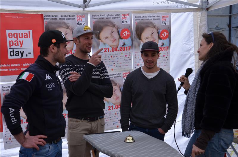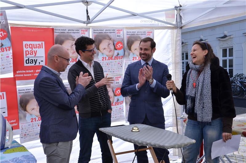 „Und der Sieger heißt: Reinhard Demetz“ verkündete die Landesrätin für Chancengleichheit Martha Stocker nach dem Wettbewerb. Jeweils drei Vertreter aus den Kategorien Politik, Wirtschaft, Kirche und Sport wetteiferten am Bügelbrett um den Sieg, am Ende kürte die ausschließlich weiblich besetzte Jury den Seelsorgeamtsleiter der Diözese Bozen-Brixen zum Bügelkönig des diesjährigen Equal Pay Day. Landesrätin Martha Stocker, die Präsidentin des Landesbeirates für Chancengleichheit Ulrike Oberhammer, Kammerabgeordnete Luisa Gnecchi und Gleichstellungsrätin Michela Morandini legten mit überaus wachsamen Augen Wert auf faltenfreie Wäsche. Mit einem Augenzwinkern überreichte Landesrätin Stocker dem Sieger nach getaner Arbeit die Trophäe. „Mit viel Humor wollen wir Männer dazu motivieren, sich verstärkt auch im Haushalt zu engagieren, denn Haus- und Familienarbeit soll nicht nur reine Frauendomäne sein.“