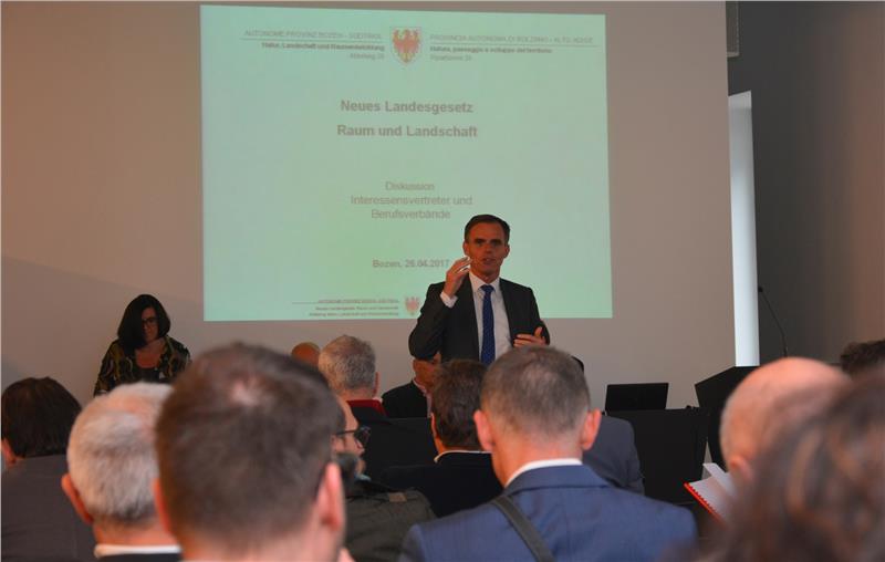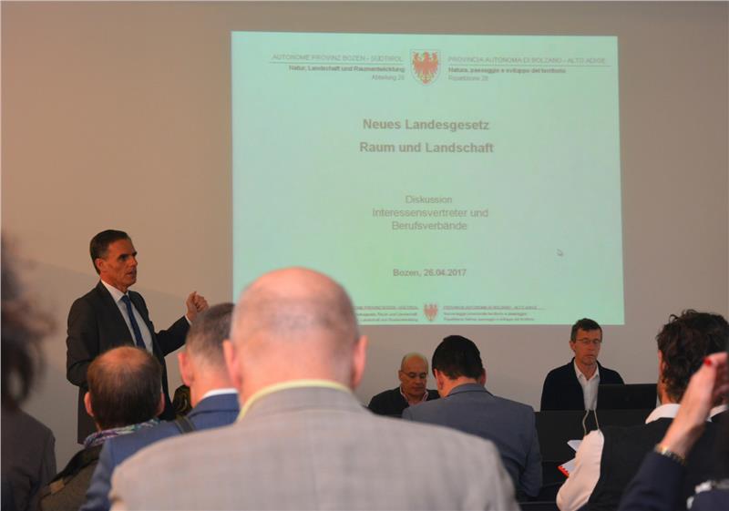 Für die Ausarbeitung des Landesgesetzes Raum und Landschaft, das jenes für Raumordnung und jenes für Landschaftsschutz ablösen wird, ist gestern die dritte von vier Phasen beendet worden. Phase eins war im Herbst 2014 mit dem Diskussionsprozess der Leitlinien des neuen Gesetzes gestartet und rund ein Jahr später beendet worden, was folgte war die Erarbeitung eines Rohentwurfs, den Landesrat Richard Theiner Anfang September vergangenen Jahres vorgestellt hat. Dieser Entwurf ist in den letzten Monaten umfassend und bis ins Detail mit den Interessenvertretern und Berufsverbänden diskutiert worden. „Die aufgeworfenen Punkte waren und sind für uns von enormer Bedeutung, wir schätzen es sehr, dass sich die Organisationen dermaßen konstruktiv eingebracht haben“, so Landesrat Theiner.