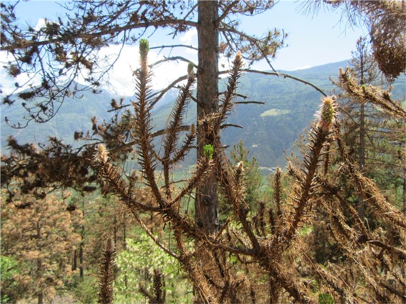 Seit einigen Wochen sind im Vinschgau, vor allem auf der Sonnseite zwischen Naturns und Schlanders, deutliche Verfärbungen an den Föhren zu beobachten. Dabei handelt es sich zu einem großen Teil um Bäume, die durch die extreme Trockenheit vor allem der letzten zwei Jahre geschädigt wurden. In der Folge stieg auch die Anfälligkeit für Angriffe von Borkenkäfern und Pilzinfektionen, sodass Föhren nun örtlich absterben, heißt es aus dem Forstinspektorat Schlanders. Solche Phänomene sind in Südtirol ab den 1980er-Jahren schon wiederholt aufgetreten, im Vinschgau beispielsweise starben ab 1993 flächig Föhrenwälder auf der Schattseite zwischen Latsch und Naturns ab. Betroffen waren immer - jeweils nach Trockenjahren - Waldföhrenwälder der tiefen Lagen, wo von Natur aus laubholzreiche Wälder vorkommen, berichtet der stellvertretende Amtsdirektor Georg Pircher. Die Klimaextreme haben nun offensichtlich diese Entwicklung beschleunigt. Andere Teilflächen erscheinen braun, da sie vom Kiefenprozessionsspinner kahl gefressen wurden. Dieser Fraß allein bringt die Pflanze jedoch nicht zum Absterben; diese Föhren besitzen intakte Knospen und treiben jetzt neu aus, sodass diese Bereiche sich wieder begrünen werden.