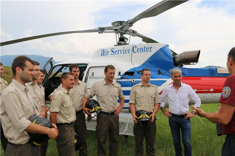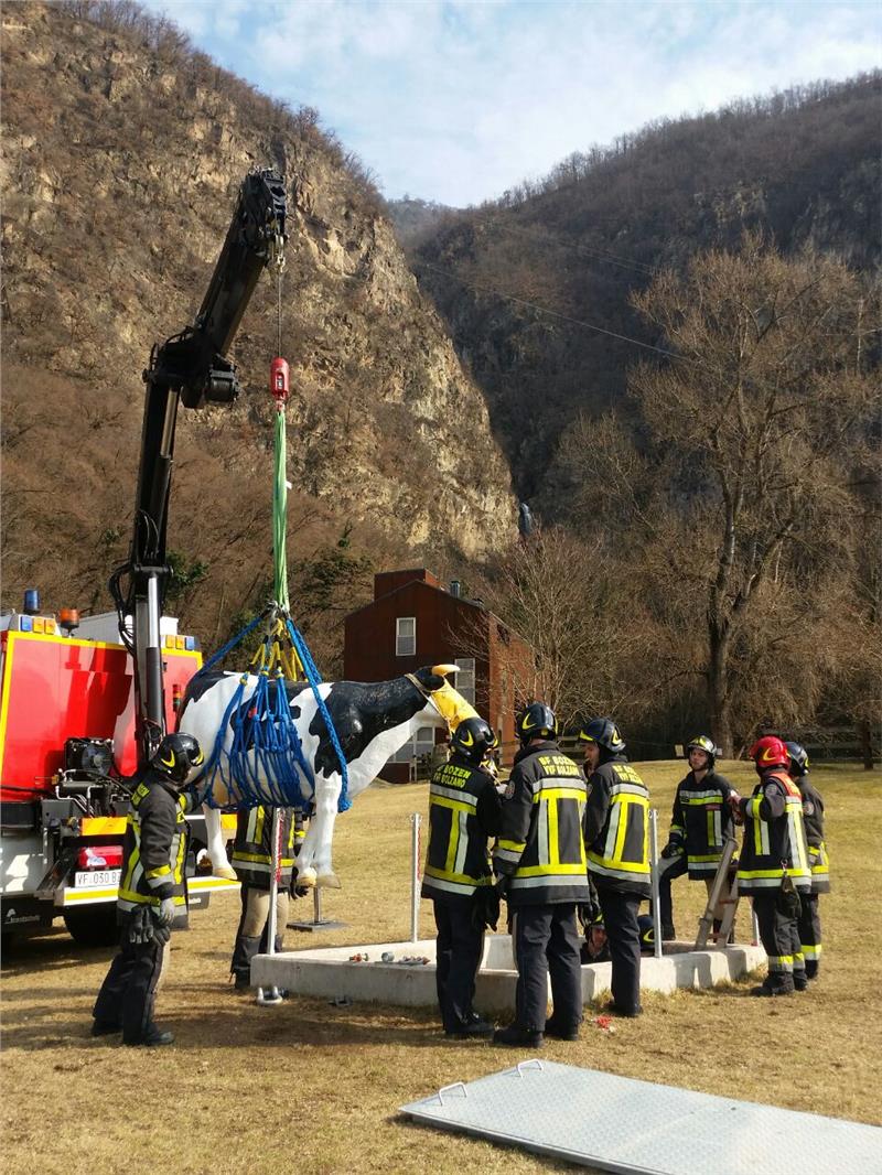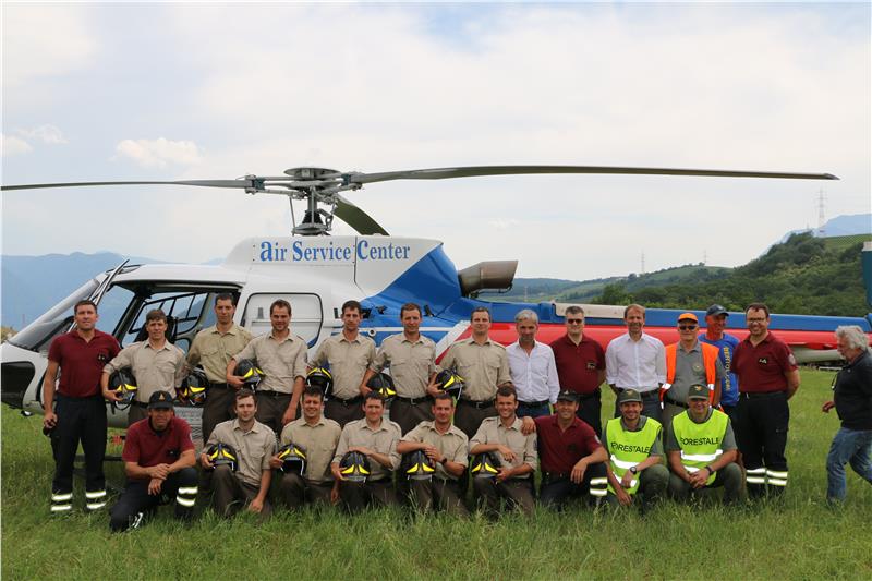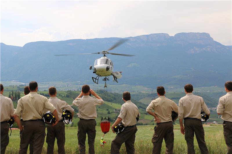 Ein Wasserbecken steht ganz oben auf der sanierten ehemaligen Mülldeponie in Sigmundskron, daneben aufgereiht Feuerwehrautos. Männer in Uniform mit dem Abzeichen der Berufsfeuerwehr Bozen folgen, mit dem Helm unterm Arm, den Ausführungen des Piloten. Gleich wird der Hubschrauber abheben und einen gefüllten Wasserkübel mehrmals über einer Fläche auskippen, die für diese Übung ausgewählt wurde. 40.000 Bäume hat das Forstinspektorat Bozen 1 in den vergangenen Jahren auf der Alt-Deponie gepflanzt; für diese Übung von zwölf angehenden Feuerwehrmännern bildet ein Abschnitt die Grundlage für einen fiktiven Waldbrand.