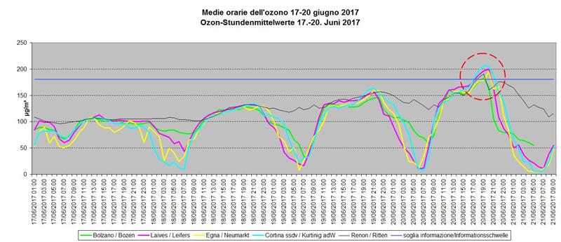 Mit dem Anstieg der Temperaturen und der Sonneneinstrahlung sind die Ozonkonzentrationen gestiegen. Darauf weist der Direktor des Labors für physikalische Chemie der Landesagentur für Umwelt, Luca Verdi, hin. Die Informationsschwelle liegt bei 180 Mikrogramm pro Kubikmeter Luft. Am 20. Juni wurde an fünf Messstationen die Informationsschwelle von 180 Mikrogramm pro Kubikmeter (µg/m³) überschritten, und zwar: in Neumarkt um 21 Uhr (Stundenmittelwert 195 µg/m³), in Kurtinig an der Weinstraße von 19 bis 22 Uhr (höchster Stundenmittelwert 207 µg/m³), in Bozen um 20 Uhr (Stundenmittelwert 183 µg/m³), in Leifers von 19 bis 21 Uhr (höchster Stundenmittelwert 200 µg/m³), am Ritten von 19 bis 20 Uhr (höchster Stundenmittelwert 191 µg/m³).