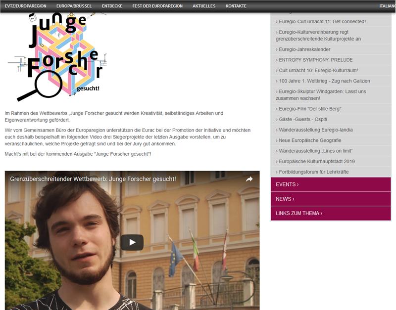 Das Gemeinsame Büro der Europaregion Tirol-Südtirol-Trentino in Bozen hat ein Video hergestellt, um die Ausschreibung des grenzüberschreitenden Schulwettbewerbs “Junge Forscher gesucht” von Eurac Research zu begleiten und zu promoten. Der Filmbeitrag stellt die drei Siegerprojekte der letzten Ausgabe vor. Damit soll veranschaulicht werden, welche Projekte gefragt sind und bei der Jury gut ankommen.