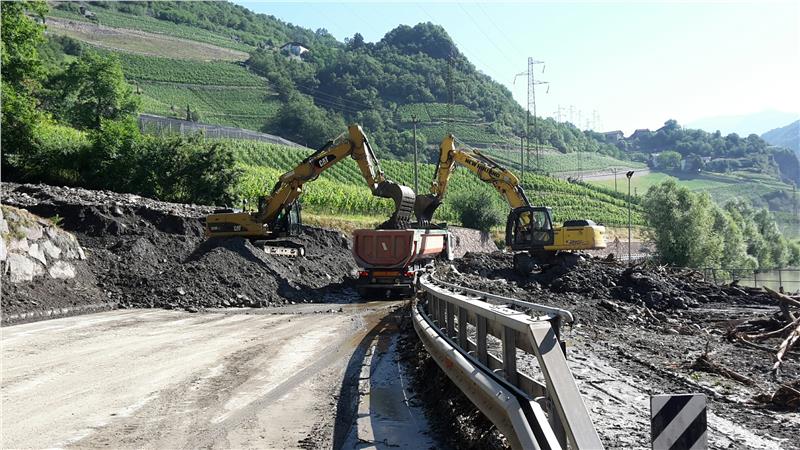 Nach den heftigen Regenfällen in der Nacht auf Sonntag lösten sich mehrere Tausend Kubikmeter Material und verschütteten die Brennerstaatsstraße nördlich von Klausen auf der Höhe des Villnösser Stausees. Unmittelbar nach den Murenabgängen wurde die Straße für den Verkehr komplett gesperrt. Die Aufräumarbeiten starteten gleich Sonntagfrüh mit dem Abtransport des Materials.