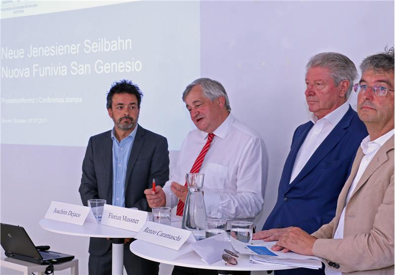 Das Projekt für die neue Seilbahn Bozen-Jenesien haben Mobilitätslandesrat Florian Mussner und die Bürgermeister Renzo Caramaschi (Bozen) und Paul Romen (Jenesien) am 7. Juli gemeinsam mit STA-Direktor Joachim Dejaco und dem Direktor der Landesabteilung Mobilität Günther Burger in Bozen vorgestellt.