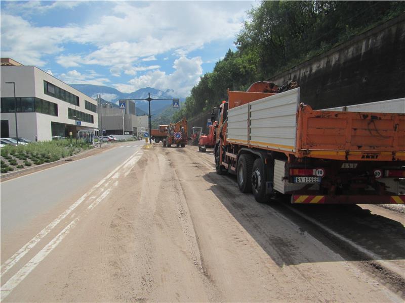 Nach Absprache mit den Geologen und intensiven Aufräumarbeiten konnte bereits eine Fahrspur der Brennerstaatsstraße (SS 12) bei Kampill in Bozen nach dem Murenabgang wieder für den Verkehr geöffnet werden. Im Einsatz ist die gesamte Mannschaft des Straßendiensts Bozen. Das Material wird mit drei Lastkraftwagen und einem Lader ständig abtransportiert.
