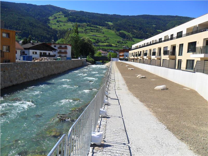 Abgeschlossen sind hingegen die Arbeiten zur Errichtung eines 200 Meter langen Dichtschirms mit Hilfe von Erdbetonsäulen im bestehenden Damm orographisch links des Eisacks flussaufwärts bis zur Flainser Brücke. Zudem wurde auf einer Länge von etwa 100 Metern und im Abstand von rund neun Metern zum Flussdamm eine Stahlbetonmauer verwirklicht. Mit diesem mittlerweile sechsten Baulos wurde die Sicherheit vor Hochwasser für die bachnahen Gebiete in den Gemeinden Sterzing und Pfitsch weiters erhöht.