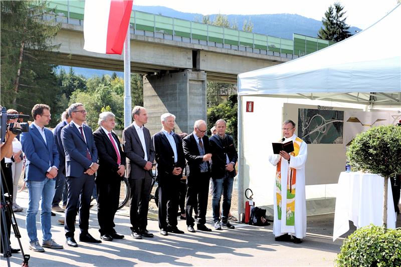 Nach der Segnung durch Dekan Josef Wieser wurde der neue Verkehrsweg mit dem Banddurchschneiden symbolisch eröffnet und gleich eine Probefahrt durchgeführt. Die neue Ausfahrt wird am Nachmittag für den Verkehr freigegeben.