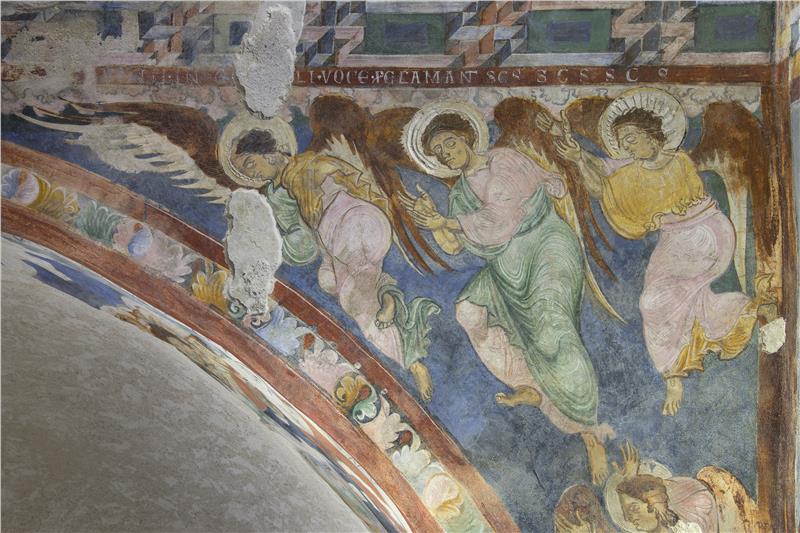 In der Apsidenwölbung hat sich das Fragment des Christus in der Mandorla erhalten, rechts davon eine dicht gedrängte Gruppe von Heiligen mit Musikinstrumenten, Märtyrerpalmen und zwei Apostel. An der von einem Palmettenfries gerahmten Triumphbogenwand sind unter einem Wolkenband Cherubine und Seraphine zu sehen mit einer darüber liegenden lateinischen Inschrift aus dem Te Deum laudeamus ("Die Engel rufen mit nie endender Stimme, heilig, heilig, heilig"). Das Thema des Lobgesangs der himmlischen Heerscharen, der Apostel, Propheten, Märtyrer, der ganzen Kirche hat für die Apsisbemalung zentrale programmatische Bedeutung.
