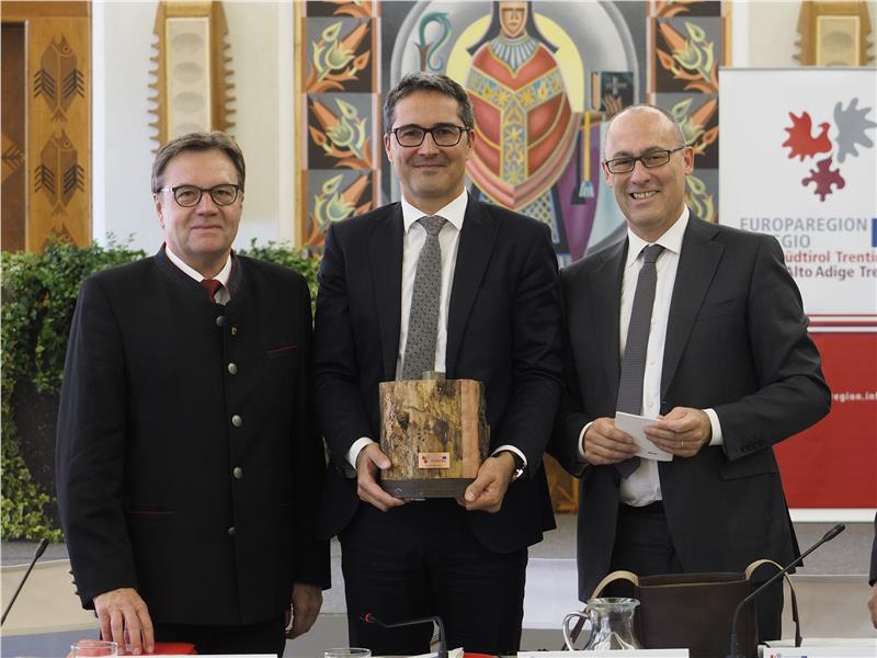 Der Europäische Verbund für territoriale Zusammenarbeit EVTZ "Europaregion Tirol-Südtirol-Trentino" war im Oktober 2011 auf Schloss Tirol aus der Taufe gehoben worden. Südtirol führte während der ersten zwei Jahre den Vorsitz, Präsident war Luis Durnwalder. Sechs Jahre nach diesem historischen Akt werden die Organe des EVTZ nun turnusgemäß den dritten Präsidentenwechsel vollziehen: Stand nach Günther Platter bisher Ugo Rossi als Präsident an der Spitze der Euregio, wird es in den kommenden beiden Jahren Arno Kompatscher sein. "Wir wollen Europa von unten bauen mit der Euregio", betonte der neue Euregio-Präsident Arno Kompatscher bei der Stabübergabe.