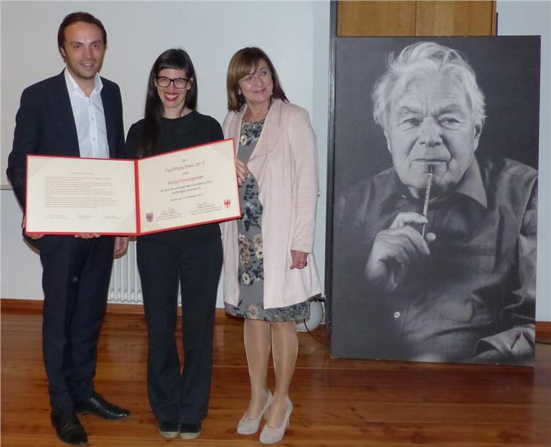 Annja Krautgasser ist die Trägerin des Paul-Flora-Preises 2017. Kulturlandesrat Philipp Achammer und seine Nordtiroler Amtskollegin Beate Palfrader haben heute Abend (12. Oktober) im Rathaus von Glurns der aus Tirol stammenden Künstlerin den mit 10.000 Euro dotierten Kunstpreis überreicht.