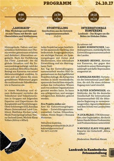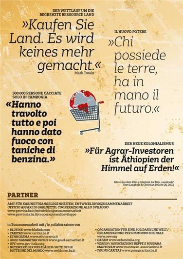 Weltweit, und besonders in Ländern im Globalen Süden, ist ein Wettlauf um die begrenzte Ressource Land im Gange. Kleinbauern verlieren ihre Lebensgrundlage, Monokulturen zerstören wertvolle Natur- und Kulturlandschaft. Die Gewinner sind einige wenige: korrupte Regierungen und große Unternehmen. Der diesjährige Tag der Entwicklungszusammenarbeit, den das Landesamt für Kabinettsangelegenheiten in Zusammenarbeit mit verschiedenen Organisationen veranstaltet, beschäftigt sich daher mit dem Thema "Landraub. Das Ringen um die Böden im Süden der Welt". Der Tag der Entwicklungszusammenarbeit findet am Dienstag, 24. Oktober, an der europäischen Akademie Eurac statt. Beginn ist um 8 Uhr.