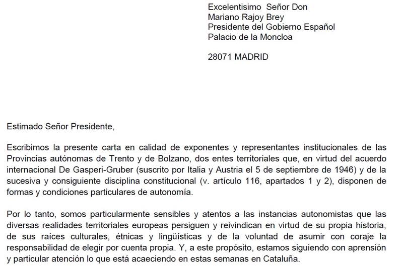Nach einer Zeit starker Spannungen habe die Autonomie der Bevölkerung in Südtirol und dem Trentino Frieden und Wohlstand garantiert, schreiben die beiden Landeshauptleute. Sie geben gegenüber dem spanischen Regierungschef Mariano Rajoy und dem Präsidenten Kataloniens, Carles Puigdemont, ihrer Hoffnung Ausdruck, Spanien und Katalonien mögen sich einem konstruktiven Dialog öffnen in gegenseitiger Achtung und gegenseitigem Verständnis für die jeweiligen Standpunkte und unter Beachtung der verschiedenen Instanzen.