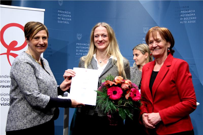 Die Förderpreise für Diplomarbeiten zum Thema Chancengleichheit wurden heuer zum 17. Mal vergeben. "Zum Teil nutzen wir die ausgezeichneten Arbeiten auch als Grundlage für unsere Tätigkeit", sagte Beiratspräsidentin Oberhammer. Auf Grundlage der Arbeit, mit der Sandra Sordini im vergangenen Jahr den ersten Preis erreicht hat, sei zum Beispiel eine Wanderausstellung konzipiert worden. Sordini hatte sich mit der Definition und Darstellung von Geschlecht auseinandergesetzt und in vielen Gesprächsrunden mit Menschen unterschiedlicher sozialer Schichten und unterschiedlichen Alters Bilder und Ausdrucksweisen von Frauen in der Gesellschaft nachgezeichnet.