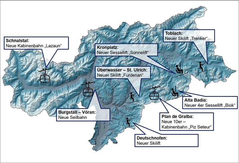 Im Laufe des Jahres 2017 wurden eine ganze Reihe von Anlagen neu gebaut, potenziert oder einer Überprüfung unterzogen. Das größte umgesetzte Vorhaben ist die neue Seilbahn Burgstall-Vöran, die 360 Personen pro Stunde befördert und deren Fahrzeit von acht auf fünf Minuten verkürzt wurde. Gebaut wurde die neue Bahn, die nun mit einer anstelle von fünf Stützen auskommt, vom Unternehmen Doppelmayer Italia. Im Skigebiet Gröden wurde der kuppelbare Vier-Personen-Sessellift Plan de Gralba-Piz Seteur durch eine Zehn-Personen-Kabinenbahn der Herstellerfirma Leitner, dabei wurden die Trasse verändert und eine Mittelstation errichtet. In Hochabtei wurde der Vier-Personen-Sessellift BIOK durch einen Sechser-Sessellift ebenfalls von Leitner ersetzt. Anstelle des fixen Zweisessellifts Lazaun in Kurzras errichtete Doppelmayr Italia eine Zehner-Kabinenbahn. Im Skigebiet Kronplatz wurde der kuppelbare Vierer-Sessellift Sonnenlift durch einen neuen kuppelbaren Sechs-Personen-Sessellift von Leitner ausgetauscht. In Deutschnofen wurde der Dorf-Schlepplift Deutschnofen von Leitner neu gebaut, zudem wurde die Abfahrtspiste verbessert. In Toblach im Kleinstskigebiet Rienz wurden der Schlepplift Trenker von Leitner erneuert und die Piste verbreitert. In Überwasser in der Gemeinde Kastelruth wurde der Schlepplift Furdenan von Doppelmayr auf leicht verlängerter Trasse neu gebaut.