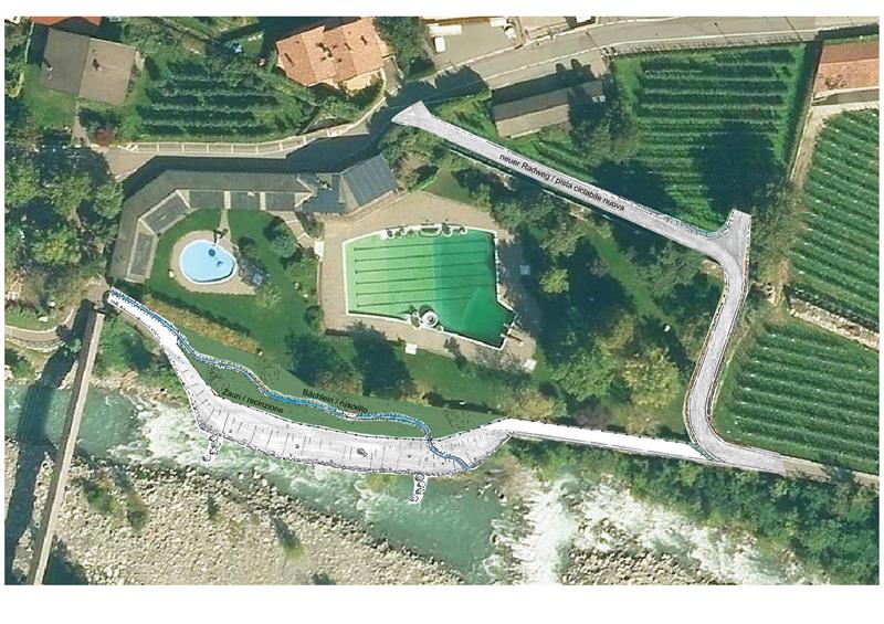 Das linkseitige Etschufer wird mittels einer Blockwurfmauer abgesichert. Damit zum Flussbett hin eine frei begehbare Böschung entsteht, wird die bestehende Ufermauer mit Bachmaterial überschüttet und teilweise begrünt. Der oberste Bereich des neuen Ufers wird eingezäunt und somit Teil des Schwimmbades. "Ein kleines Bächlein wertet den neu gestalteten Bereich zusätzlich auf und bietet vor allem Spielmöglichkeiten für Kinder", erläutert Projektant und Bauleiter Thomas Thaler.