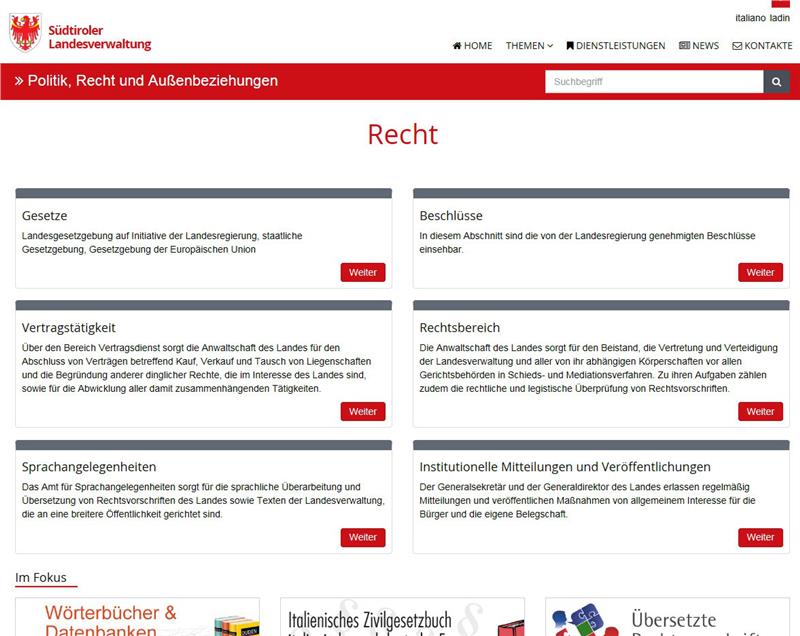 http://www.provinz.bz.it/politik-recht-aussenbeziehungen/recht/ ist die Adresse der neuen Webseite. Gleich mehrere Ämter und Abteilungen waren bereichsübergreifend an diesem Projekt beteiligt und haben mit der technischen Unterstützung der Südtirol Informatik AG (SIAG) das neue Internetportal erstellt. In übersichtlicher Weise werden hier die Landesgesetze, die Beschlüsse der Landesregierung und die Vertragstätigkeit der Anwaltschaft des Landes präsentiert, aber auch der gesamte Rechtsbereich und der Sprachgebrauch der Südtiroler Landesverwaltung, die übersetzten Rechtsvorschriften sowie die Veröffentlichungen und Mitteilungen der Generaldirektion und des Generalsekretariats. Bisher waren diese Inhalte auf verschiedenen Webseiten verteilt, was die Suche nach den gewünschten Informationen erschwerte. Der Nutzer sieht nun bereits auf der Startseite, welche Themen ihn erwarten.