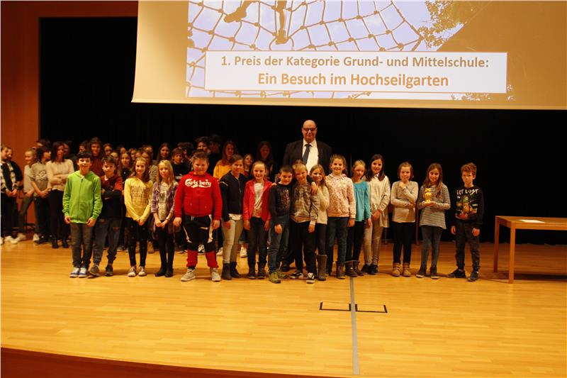 In der Kategorie Grund- und Mittelschule errang die 4A aus St. Martin in Passeier den ersten Platz. Die Schüler eröffneten die Veranstaltung mit einem selbstgetexteten Lied und kommentierten verschiedene Kinderrechte, die ihnen am Herzen lagen und zu denen sie auch konkrete Aktionen organisiert hatten. So sammelten die Schülerinnen und Schüler etwa Geld, um drei Kindern eines afrikanischen Staates den Schulbesuch zu ermöglichen. Ihr Preis ist ein Besuch in einem Hochseilgarten.