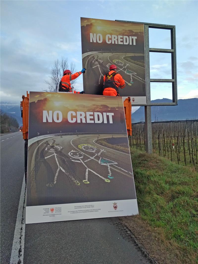 Südtirols Straßen sicherer machen und Unfälle vermeiden, dies sind die wichtigsten Ziele der Sensibilisierungskampagne "No Credit", die seit mehr als zehn Jahren läuft. Mit dem Fokus auf die Motorradfahrer, aber auch auf alle anderen Verkehrsteilnehmer, startet die Ausgabe 2018. Durch entsprechende Aktionen sollen sie alle zu sicherem und vernünftigem Fahren angeregt werden. Die ersten Plakate mit dem neuen Sujet der Kampagne hat der Straßendienst des Landes bereits längs der Straßen angebracht. Weitere Aktionen folgen.