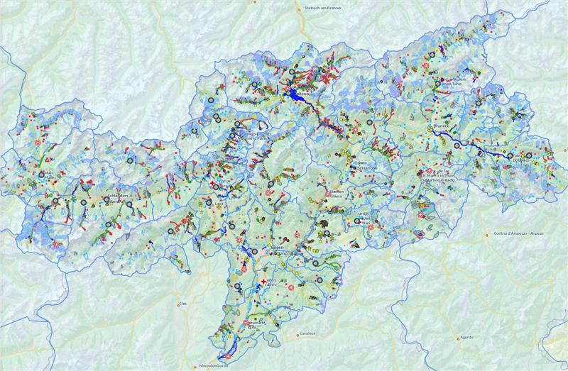 Erfasst sind nicht nur die relevanten Naturgefahren in Form von früheren Ereignissen oder durch die Gefahrenzonenpläne Südtirols, sondern auch sensible Infrastrukturen wie Störfallbetriebe, von denen potentiell Gefahr ausgehen könnte.