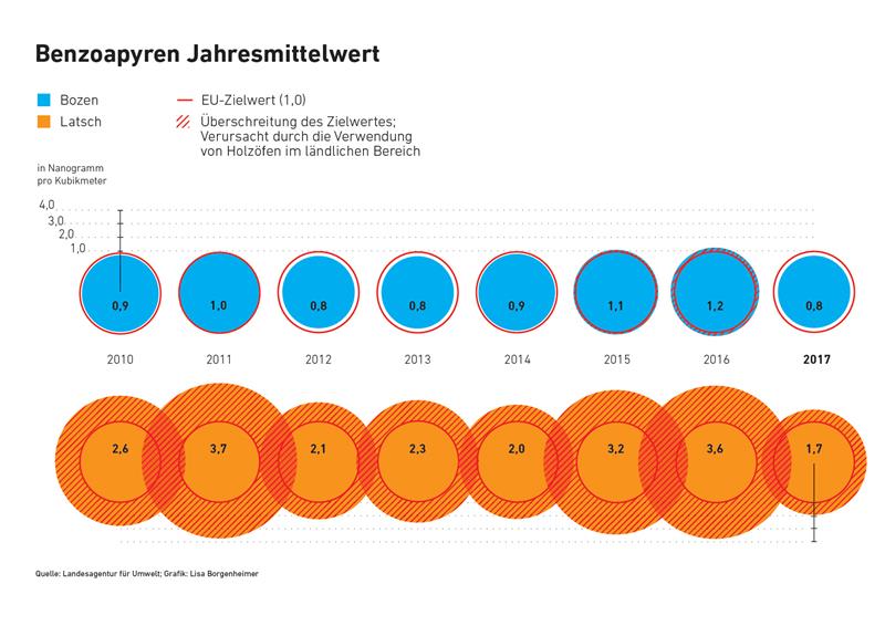 Eine spezielle Situation stellt das Benzo(a)pyren, eine Komponente des Feinstaubs, dar. Die EU gibt hier als Zielwert vor, den Jahresmittelwert von einem Nanogramm pro Kubikmeter nicht zu überschreiten. Die Werte in einigen Gemeinden des ländlichen Raums in Südtirol liegen weit darüber. Beispiel Latsch: Hier betrug der Jahresmittelwert 2016 3,6 Nanogramm pro Kubikmeter, 2017 waren es 1,7 Nanogramm pro Kubikmeter. "Benzo(a)pyren gehört zu den polyzyklischen aromatischen Kohlenwasserstoffen, die gesundheitsschädigend sein können", erklärt Georg Pichler. "Vor allem in ländlichen Gebieten, wo es viele kleine Holzöfen und -herde gibt, besteht das Problem. Denn Hauptgrund für die Entstehung dieses Schadstoffes ist die unsachgemäße Verbrennung in Holzheizungen." Mit der Kampagne "Heizen mit Holz, aber richtig" zusammen mit der Berufsgruppe der Kaminkehrer und verschiedenen Schulprojekten arbeitet die Landesumweltagentur an der Sensibilisierung der Bevölkerung in diesem Bereich. "Auch 2018 werden diese Sensibilisierungsmaßnahmen fortgesetzt", betont Theiner, "und auch Strafen für jene, die ihre Öfen nicht korrekt beheizen, sind nicht auszuschließen."