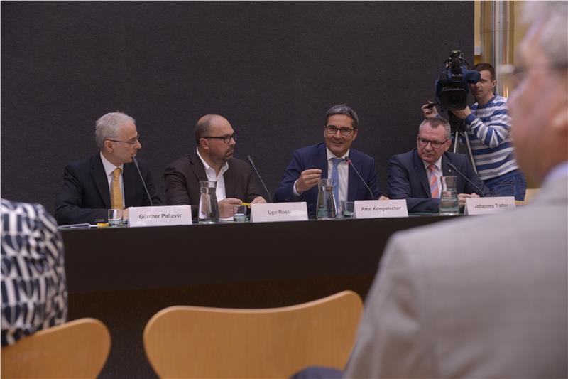"Wir haben in den vergangenen vier Jahren als Europaregion einige Leuchtturmprojekte auf den Weg gebracht", erklärte bei der abschließenden Podiumsdiskussion Euregio-Präsident Arno Kompatscher. Er sprach sich für eine kontinuierliche und nicht nur projektbezogene Form der Zusammenarbeit der drei Verwaltungen aus.