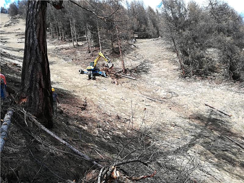 Mit dem Projekt zur Behebung der Unwetterschäden am Gehöft Pleif in Regie um 15.000 Euro wurde bereits begonnen, berichtet Amtsdirektor Georg Pircher vom Forstinspektorat Schlanders: Oberhalb der Wiesen werden mit einem Schreitbagger Geröll, Steine, Astmaterial, Wurzeln, Bäume entfernt und mit einem Transporter verladen. Die Arbeiten haben am Mittwoch vergangener Woche (18. April begonnen), da vorher noch zu viel Schnee im Hang lag. Derzeit wird ein zweites Projekt ausgearbeitet, in das ebenfalls 15.000 Euro investiert werden, mit dem die nächsten Lawinenstriche talauswärts gesäubert und gesichert werden.