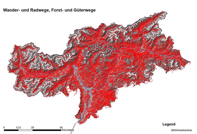 "Südtirol ist extrem anthropisiert", unterstrich Landeshauptmann Kompatscher und verwies auf die beiden Karten (im Anhang): "Es ist, wie aus diesen Karten hervorgeht, schwierig, Rückzugsräume zu finden, in denen sich Wölfe und Bären ungestört aufhalten können - deshalb sind Konflikte vorprogrammiert."