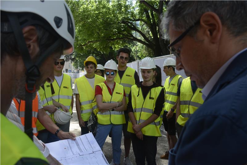 Schüler der Fachoberschule für Bauwesen haben sich auf dem Bozner Magnago-Platz, der neu gestaltet wird, ein Bild von den Arbeiten auf einer Baustelle gemacht.