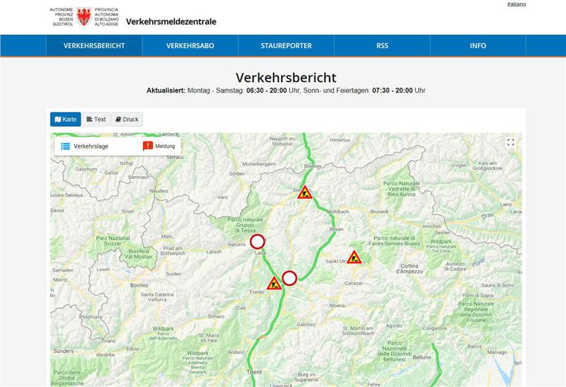 An 365 Tagen im Jahr gibt die Verkehrsmeldezentrale aktuelle Auskünfte über die allgemeine Verkehrslage zu Verkehrsbehinderungen, Staus und Unfällen in Südtirol sowie über Baustellen, Passstraßen und Radarkontrollen, ab heute (7. August) über die neue Webseite. Auskünfte gibt es künftig auch über die Schließung der Radwege wegen Instandhaltungsarbeiten an den Dämmen, Pflanzenschnitt, Mäharbeiten usw.