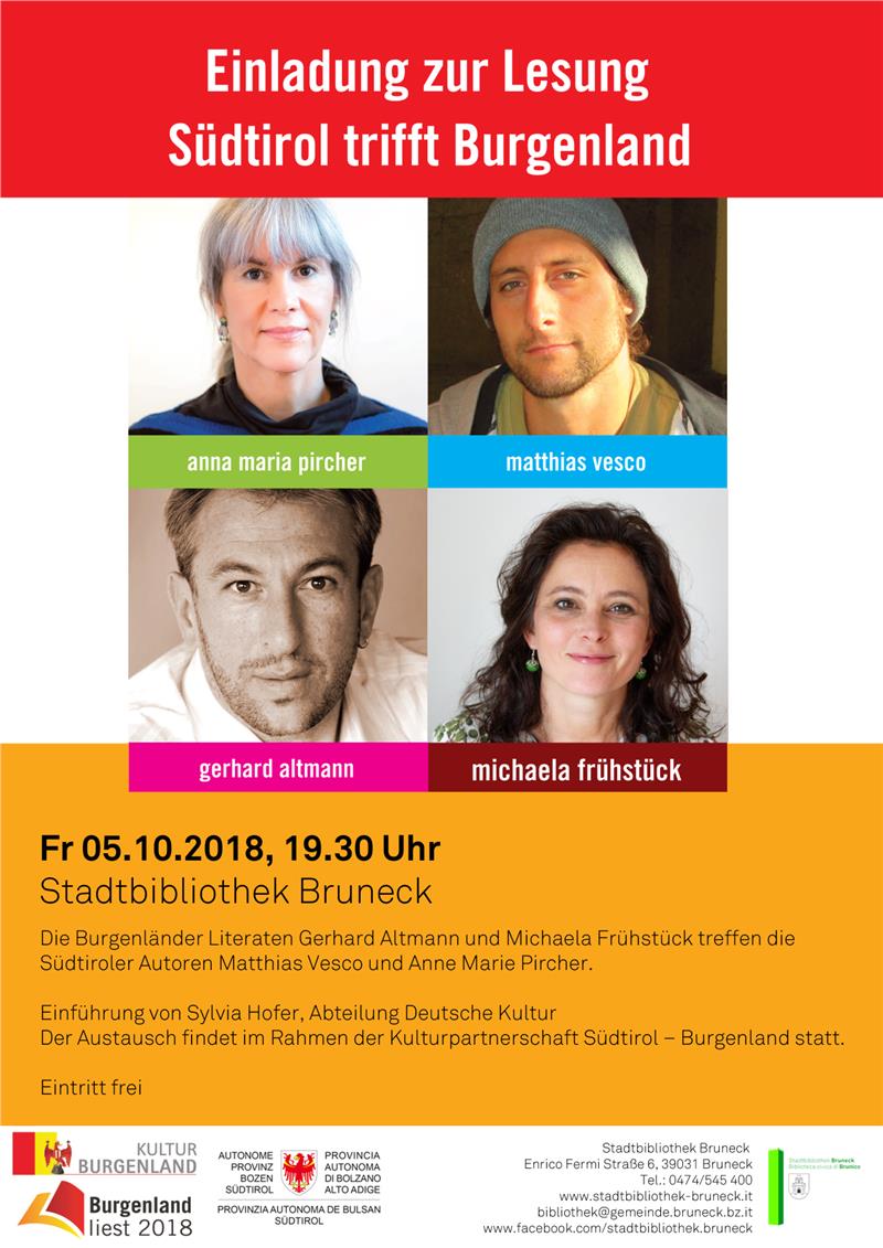 Im Zuge der Kulturpartnerschaft Burgenland-Südtirol kommen in dieser Woche die burgenländische Autorin Michaela Frühstück und der burgenländische Autor Gerhard Altmann zu zwei Lesungen nach Südtirol und treffen auf die Südtiroler Autorin Anne Marie Pircher und den Autor Matthias Vesco, und zwar am Donnerstag, dem 4. Oktober, um 20.00 Uhr in der Landesbibliothek Teßmann in der Armando-Diaz-Straße 8 Bozen und am Freitag, dem 5. Oktober, um 19.30 Uhr in der Stadtbibliothek Bruneck in der Enrico-Fermi-Straße 6. Im Mittelpunkt steht dabei das Thema Identität. Es moderiert Sylvia Hofer von der Landesabteilung Kultur.