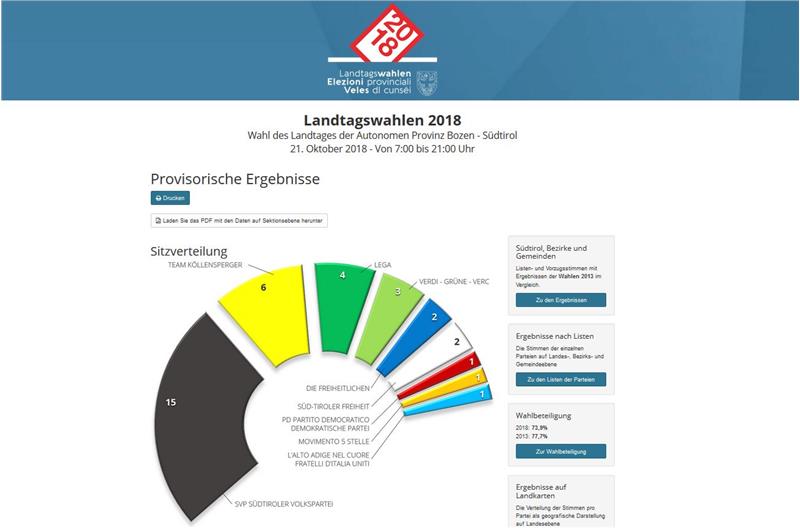 Ohne Zwischenfälle ist die Wahl des neuen Südtiroler Landtags am 21. Oktober verlaufen. Der zeitliche Rahmen für die Stimmabgabe war gegenüber der Landtagswahl 2013 etwas eingeschränkt und die Urnen bereits um 21 Uhr geschlossen worden. Erstmals hat die Landesverwaltung als Wahlbehörde – ganz im mitteleuropäischen Trend – gleich nach Schließung der Wahllokale mit der Stimmauszählung begonnen. Vorbereitung und Abwicklung der Wahl haben den federführenden Landesämtern große Anstrengungen abgefordert. "Die gesamte Maschinerie hat ausgezeichnet zusammengearbeitet, die Abläufe und damit auch die zeitlichen Vorgaben, die wir uns gestellt hatten, konnten eingehalten werden", bestätigt die Direktorin im Landesorganisationsamt, Patrizia Nogler.