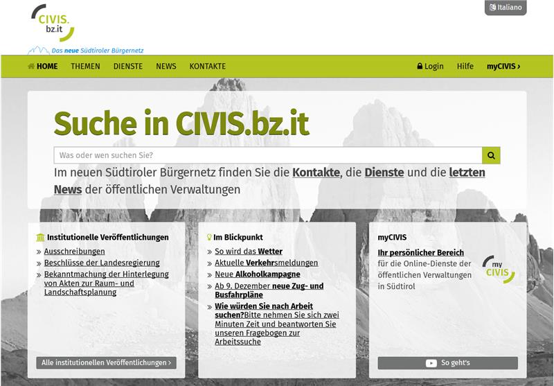 Seit Oktober 2018 ist das Südtiroler Bürgernetz unter neuem Namen und neuem Erscheinungsbild online. Bürger und Unternehmen finden dort thematisch geordnet und behördenübergreifend Informationen, Dokumente und Formulare der öffentlichen Verwaltung. Auch eine Übersicht aller Neuigkeiten aus Landesverwaltung, Südtiroler Sanitätsbetrieb und Gemeinden ist auf Civis zu finden. Seit seinem Relaunch vor zwei Monaten verzeichnet die Seite schon über 100.000 Zugriffe, im Durchschnitt hat bereits jeder zehnte Südtiroler die Seite www.civis.bz.it angeklickt. Über den persönlichen Bereich myCIVIS können die Nutzer auf die mittlerweile 78 Online-Dienste des öffentlichen Dienstes zugreifen und Einsicht in Unterlagen und Mitteilungen nehmen. "Wir haben mit dem neuen Bürgernetz Civis eine behördenübergreifende Plattform, die smart, einfach, übersichtlich und sicher Zugang zu Diensten der öffentlichen Verwaltung gewährt", betont IT- und Verwaltungslandesrätin Waltraud Deeg. Dies wurde vor Kurzem auch auf gesamtstaatlicher Ebene anerkannt, indem das neue Bürgernetz Civis mit dem zweiten Platz beim "Premio Agenda Digitale" ausgezeichnet wurde.
