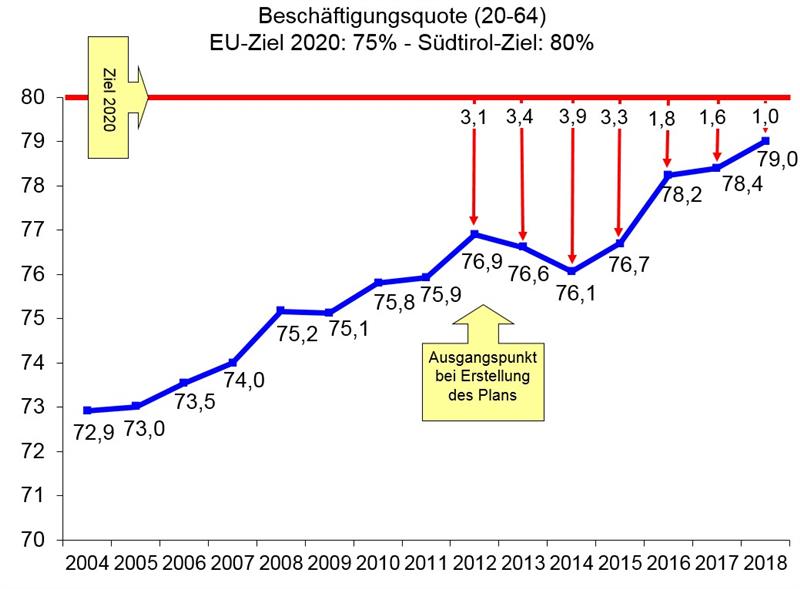 "Das Land Südtirol hatte sich in seinem Mehrjahresplan für die Beschäftigungspolitik 2013-20 für das Jahr 2020 eine Beschäftigungsquote von 80 Prozent zum Ziel gesetzt, was damals utopisch klang", erinnert der Landesrat für Arbeit und Wirtschaft, Philipp Achammer. "Nach den nun für das Jahr 2018 vorliegenden Zahlen sind wir nur mehr einen Prozentpunkt von diesem Ziel entfernt."