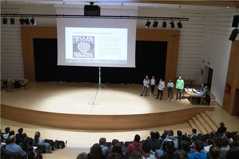 In diesem Jahr wurden sieben Projekte von Südtiroler Schulklassen von einer Jury der Bundeszentrale prämiert, darunter die Arbeiten der Klasse 4B des Kunstgymnasiums Bozens und der 4A der Wirtschaftsfachoberschule Auer zum Thema "Verrohte Sprache". Darin befassten sich die Schülerinnen und Schüler unter anderem mit der Frage, was Sprache bedeute, und stellten unter anderem fest, dass etwas, was man nicht pflege, zwangsläufig verrohen müsse. Die Direktorin der Pädagogischen Abteilung, Gertrud Verdorfer, beantwortete explizit zum Thema Fragen der Schüler und leitete das Thema mit der Überlegung ein: "Sprache ist essenziell für uns Menschen. Sie zeichnet den Menschen aus. Dass wir über Sprachen reden können, unterscheidet uns vor allem von anderen Lebewesen."