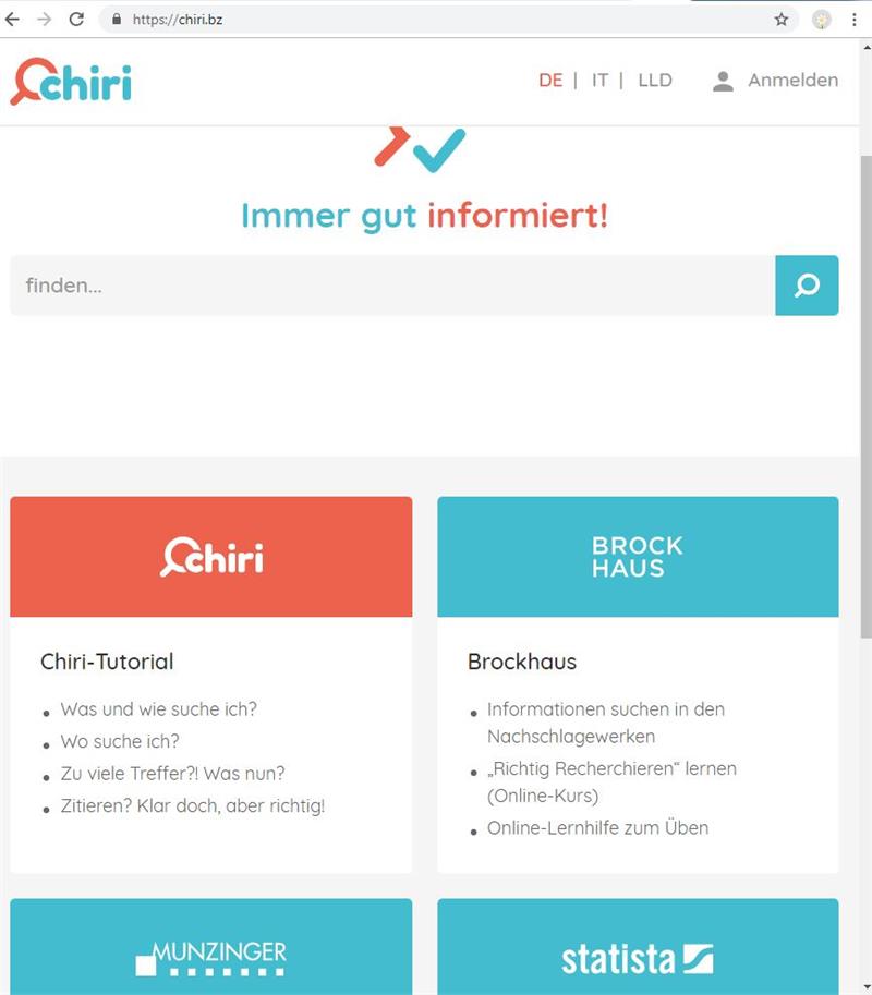 Chiri, das neue Suchportal für Schüler*innen von 13 bis 19 Jahren, ist seit September 2018 unter chiri.bz online. Eine Besonderheit des Portals ist neben den Recherchetutorials die sogenannte Metasuche: Die Schüler*innen lösen mit der Suchabfrage ein gleichzeitiges Durchsuchen der drei Datenbanken Brockhaus, Munzinger und Statista aus. Die Suchergebnisse werden dann getrennt nach Datenbank angezeigt.