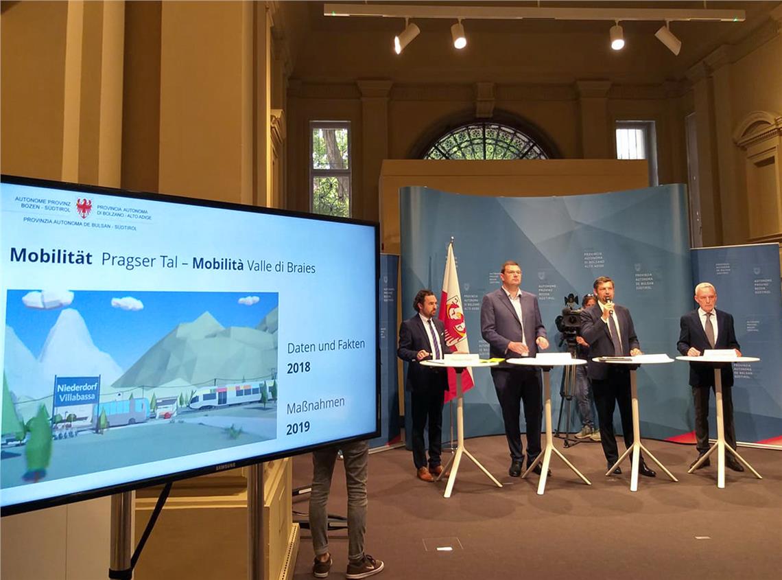 Weniger Autos und Emissionen, dafür mehr Stille, saubere Luft und ein neues nachhaltiges Naturerlebnis im Pragser Tal, darauf zielt der Plan Prags, das Mobilitätsmanagement von Land, Gemeinde und IDM für das Pragser Tal. Mobilitätslandesrat Daniel Alfreider, der Pragser Bürgermeister Friedrich Mittermair, der Präsident des Wirtschaftsdienstleisters IDM Hansi Pichler und Thomas Plank vom Destination Management Ost von IDM haben die Leitgedanken und die Aktionen 2019 am 6. Juni in Bozen vorgestellt. Vorausgegangen sind der Vorstellung ein Dialog mit den Verbänden und Organisationen sowie den Bürgern vor Ort.